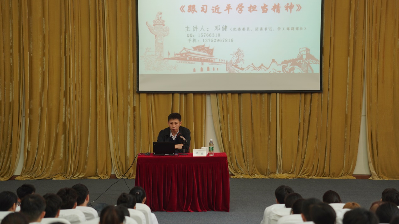 开班仪式结束后,团委书记邓健作了以《跟习近平学担当精神》为主题的首场报告。邓健结合中国共产党党史,紧紧围绕习近平总书记在深圳四十周年、抗美援朝70周年等重要历史节点的重要讲话精神中对青年提出的“担当”精神做了深入阐述,告诫青年学生要铭记历史,牢记时代赋予青年的责任和担当。
