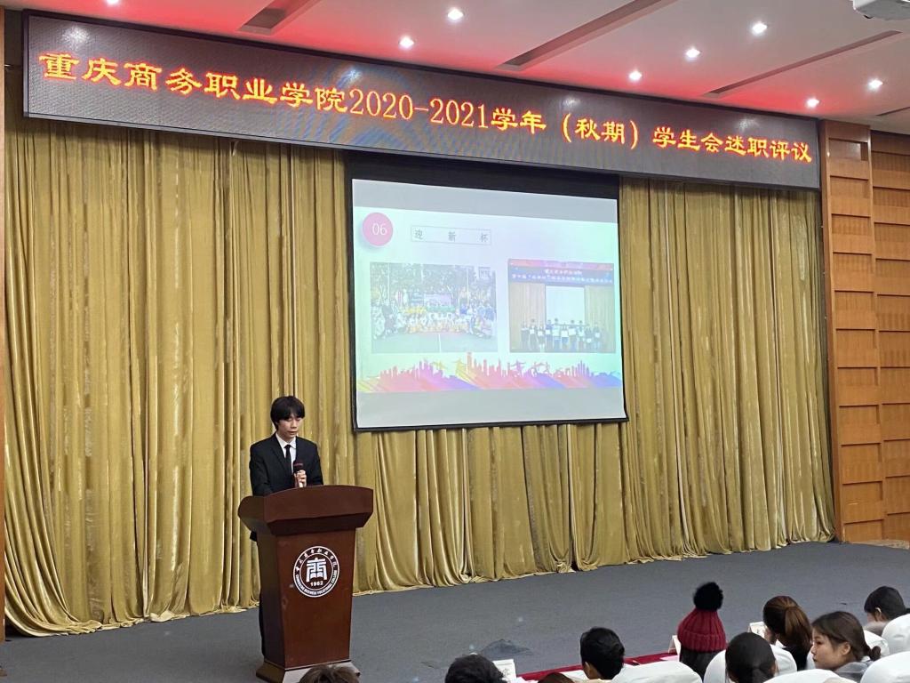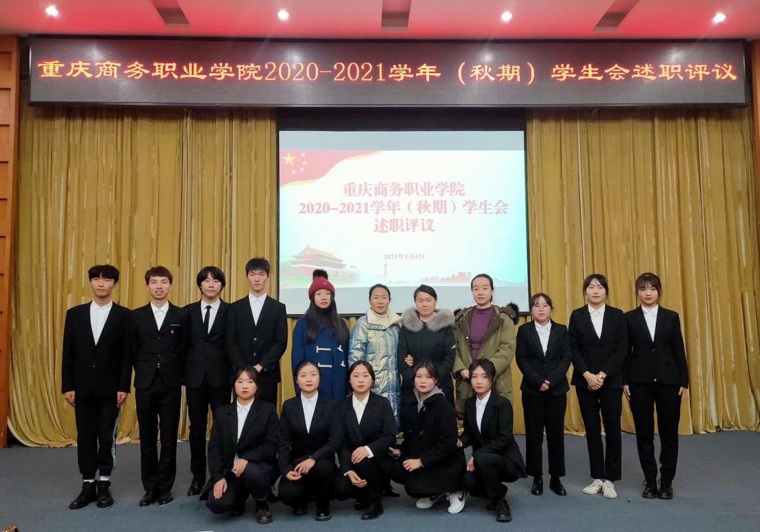 为深入贯彻落实全国学联二十七大会议精神,加强学生会组织绩效评价与总结反馈,推动学生会制度化、规范化发展, 2021年1月6日重庆商务职业学院2020-2021学年(秋期)高校学生会述职评议会在办公楼第一会议室举行。学工部、团委相关人员,校学生会全体成员、各院系学生会代表出席本次会议,会议由学生会秘书长陈小容主持。
