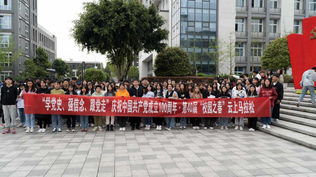 重庆商务职业学院“学党史、强信念、跟党走”庆祝中国共产党成立100周年·第40届“校园之春”云上马拉松开跑仪式于2021年3月23日下午在明德广场举行。团委负责人、团学骨干、社团成员代表和跑步爱好者300余人参加了此次活动。
