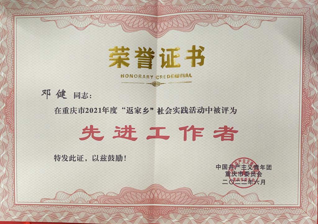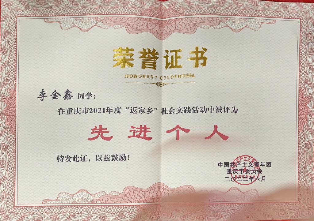 近日,由共青团重庆市委办公室印发的《关于重庆市2021年度大学生“返家乡”社会实践活动先进集体和个人的通报》,对“返家乡”社会实践活动中表现突出的单位、个人和项目通报表扬,团委书记邓健获评“先进工作者”称号,财经管理学院2019级农村金融专业1班李金鑫同学获评“先进个人”称号。