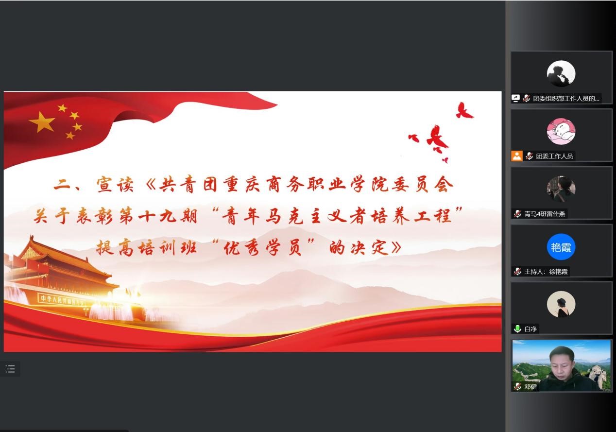 为深入贯彻落实全国高校思想政治会议和党的群团工作会议精神,培养和造就一支政治可靠、作风扎实、严格要求的学生骨干队伍使之成为政治坚定、德才兼备、素质全面、模范表率、担当重任的中国特色社会主义事业的可靠接班人。2022年12月31日下午举行重庆商务职业学院校团第十九期“青年马克思主义者培养工程”提高班结训仪式。