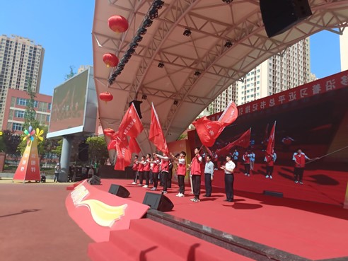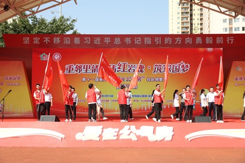 4月16日,在重庆沙坪坝区学府悦园公租房小区举行的第十一届重庆市“爱在公租房”社区邻里节开幕式上,由来自我校国旗护卫队和礼宾班组成的32名同学在此次活动中大展风采,迎着阳光让我们感受到了这四月的青春活力,他们身着红马褂,他们在台上激情挥舞旗帜,并将旗帜传递,让青春的力量聚集在此。