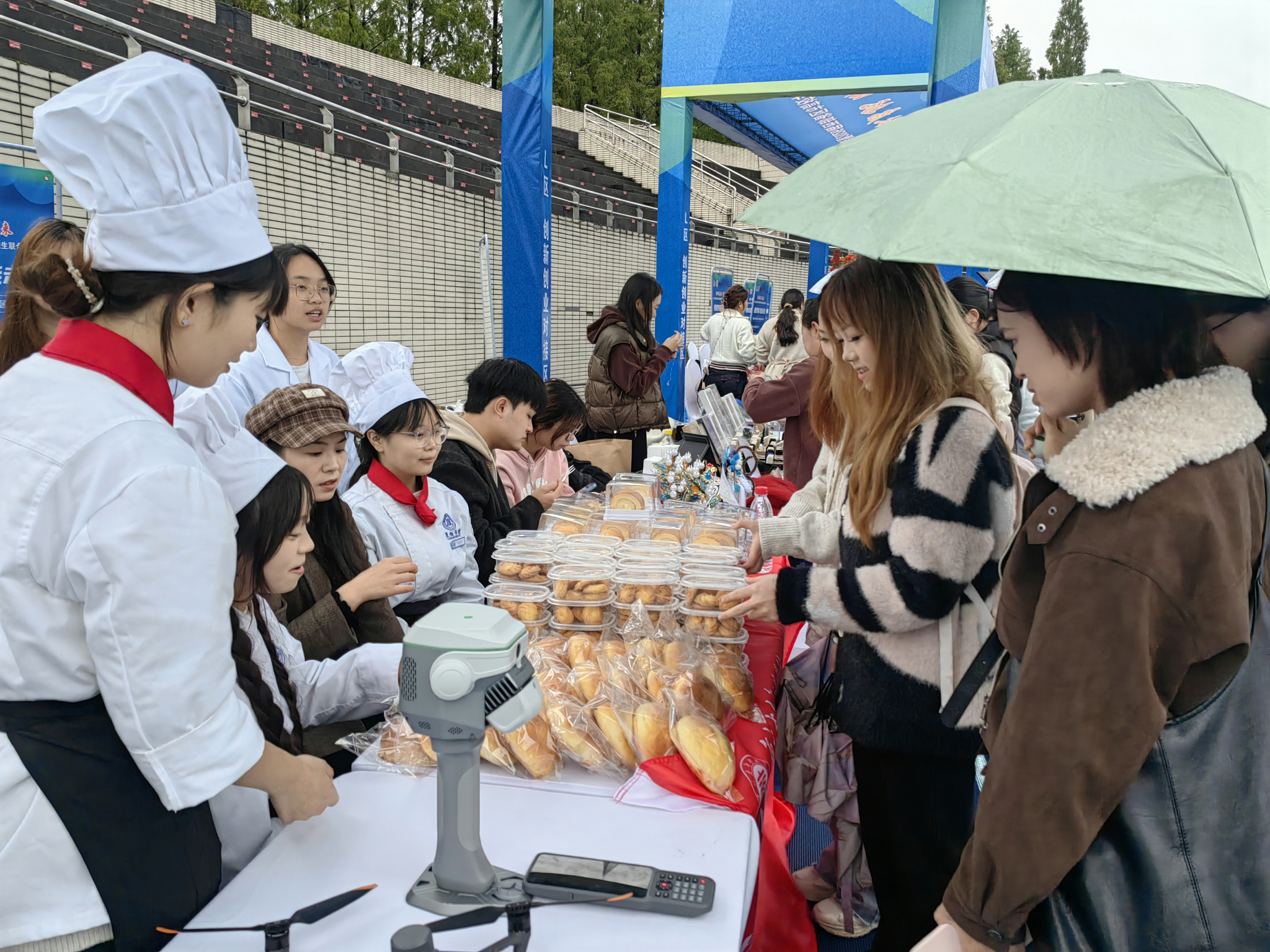 现场,项目团队带来了200余份亲手制作的面包、蛋糕、曲奇饼干等多款精致点心,香气四溢的美味吸引众多师生驻足品尝。松软的面包、绵密的蛋糕与酥脆的曲奇,不仅展现了学院学子扎实的专业技能,更传递出“幸福老小移动厨房”项目关爱老幼、传递温暖的核心初衷。独特的项目定位与鲜活的实践成果,让该项目成为现场焦点,不少师生在品尝后纷纷点赞,称赞其“既有温度又有意义”。