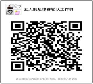 (三)组委会已创建“五人制足球赛领队工作群”,请各高校领队于3月27日前自行加入该群(只限领队加入),并在群设置中将群昵称设置为“学校+姓名”格式。未尽事宜,将通过微信工作群及时发布。