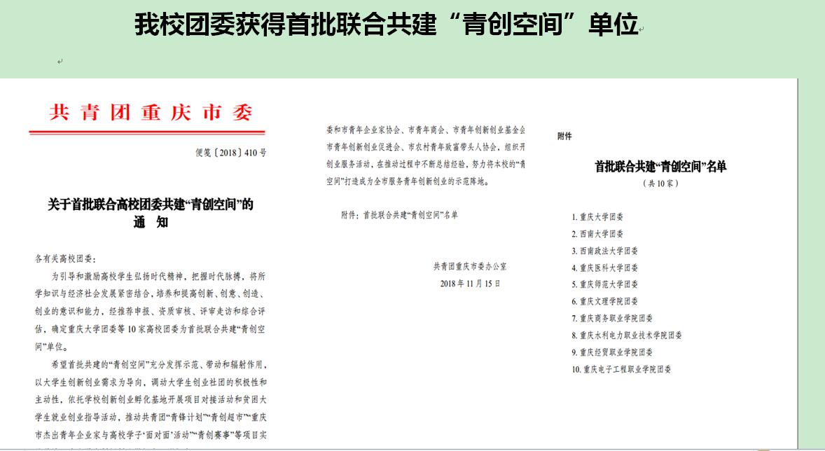 为引导和激励高校学生弘扬时代精神,把握时代脉搏,为将所学知识与经济社会发展紧密结合,培养和提高创新、创意、创造、创业的意识和能力,经推荐申报、资质审核、评审走访和综合评估,团市委共确定重庆商务职业学院团委等10家高校团委为首批联合共建“青创空间”单位。重庆商务职业学院团委将与团市委联合开展创业培训及辅导、创业训练营、创业工作坊、创业沙龙等活动,厚植校园创新创业沃土,引领和支持广大学生走在大众创业、万众创新前列。