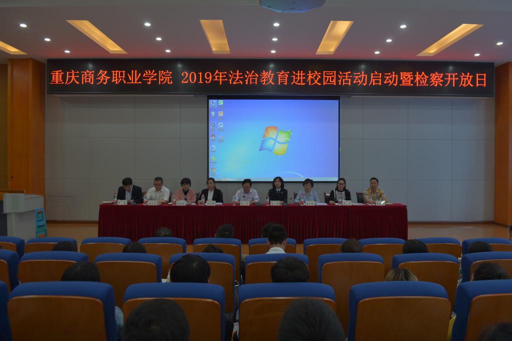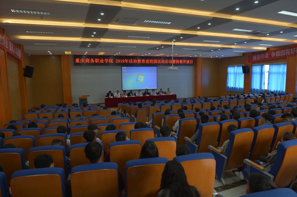 为更好地贯彻落实党的十九大精神和全国教育大会、全国教育法治工作会议精神、全市教育法治工作会议精神,4月10日下午,重庆商务职业学院联合沙坪坝区人民检察院在学校第二学术报告厅开展了“法治进校园”暨“莎姐”进校园系列活动启动仪式。沙区人民检察院副检察长吴娟,市人大代表岳永英、曾令琼,市人民监督员黄莉、蒋秋菊,重庆商务职业学院副院长舒鸿、学工部、保卫处负责人及300余名青年学生代表参加了活动。活动由重庆商务职业学院团委书记邓健主持。