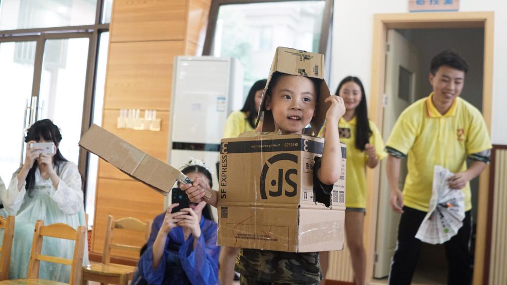 为了让小朋友认识到垃圾分类的重要意义,志愿者们将废弃的纸箱、报纸等物品与小朋友们一起制作出一件件造型精美的衣服和手工艺品。小朋友们还通过临时T型台进行了一场奇思妙想的“环保奇异造型秀”和“环保创意手工秀”。