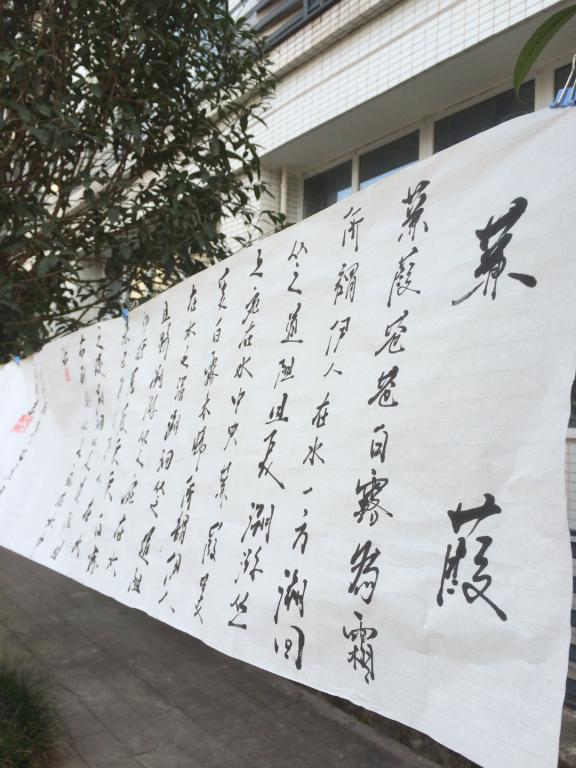 “蒹霞苍苍,白露为霜,所谓伊人,在水一方” 多么缥缈的意境,多么轻盈的字体,每一个字背后承载着书画协会成员的汗水。