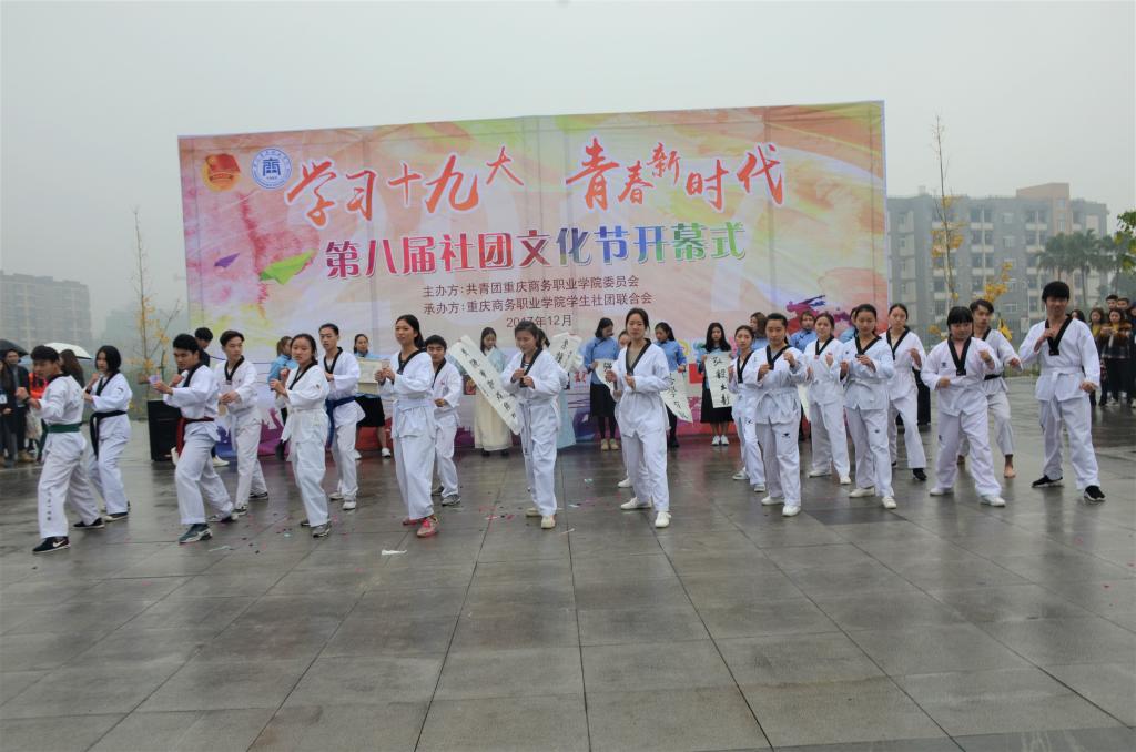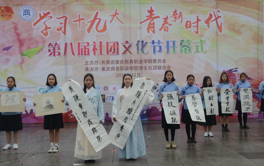 2017年12月13日中午,重庆商务职业学院“学习十九大青春新时代”第八届社团文化节开幕式在明德广场举行。学工部部长胡大勇、团委书记兼学工部副部长邓健、团委副书记陈小容、团委委员曾玉立、杨仁媛出席了开幕式,社团联合会主席李梦田主持了开幕式。