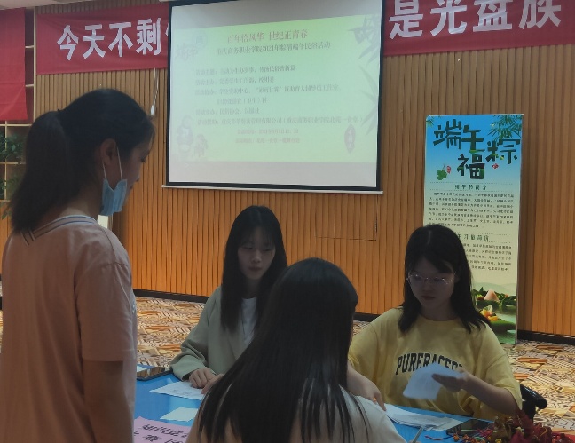 2021年6月10日下午,由党委学工部、校团委主办,学生资助中心、“沛雨甘霖”资助育人辅导员工作室、后勤处膳食(卫生)科协办,民俗协会、汉服社承办,重庆莘莘餐饮管理有限公司赞助的“百年恰风华,世纪正青春”2021年端午节民俗活动在北苑一食堂开展。