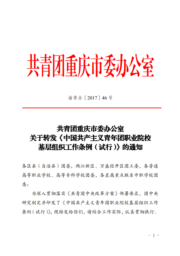 附件【(渝青办[2017]46号)关于转发《中国共产主义青年团职业院校基层组织工作条例(试行)》的通知.pdf已下载