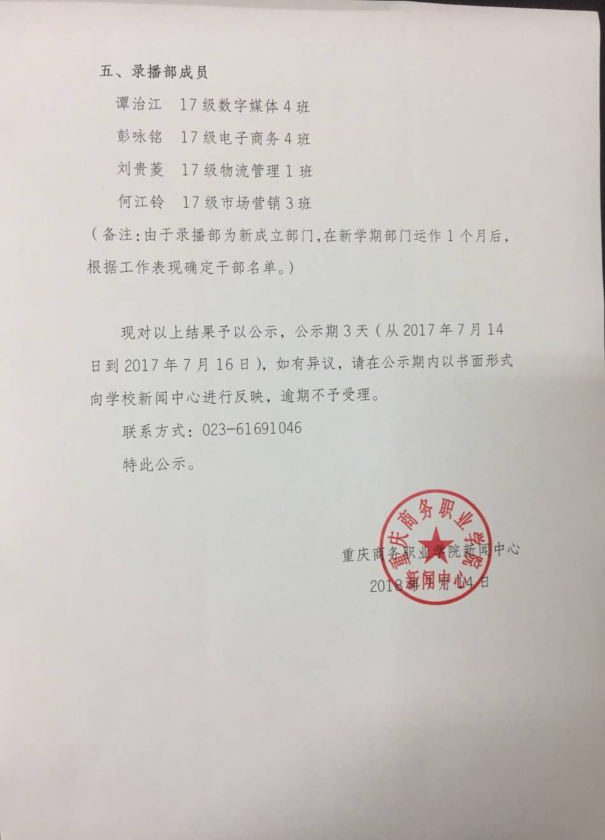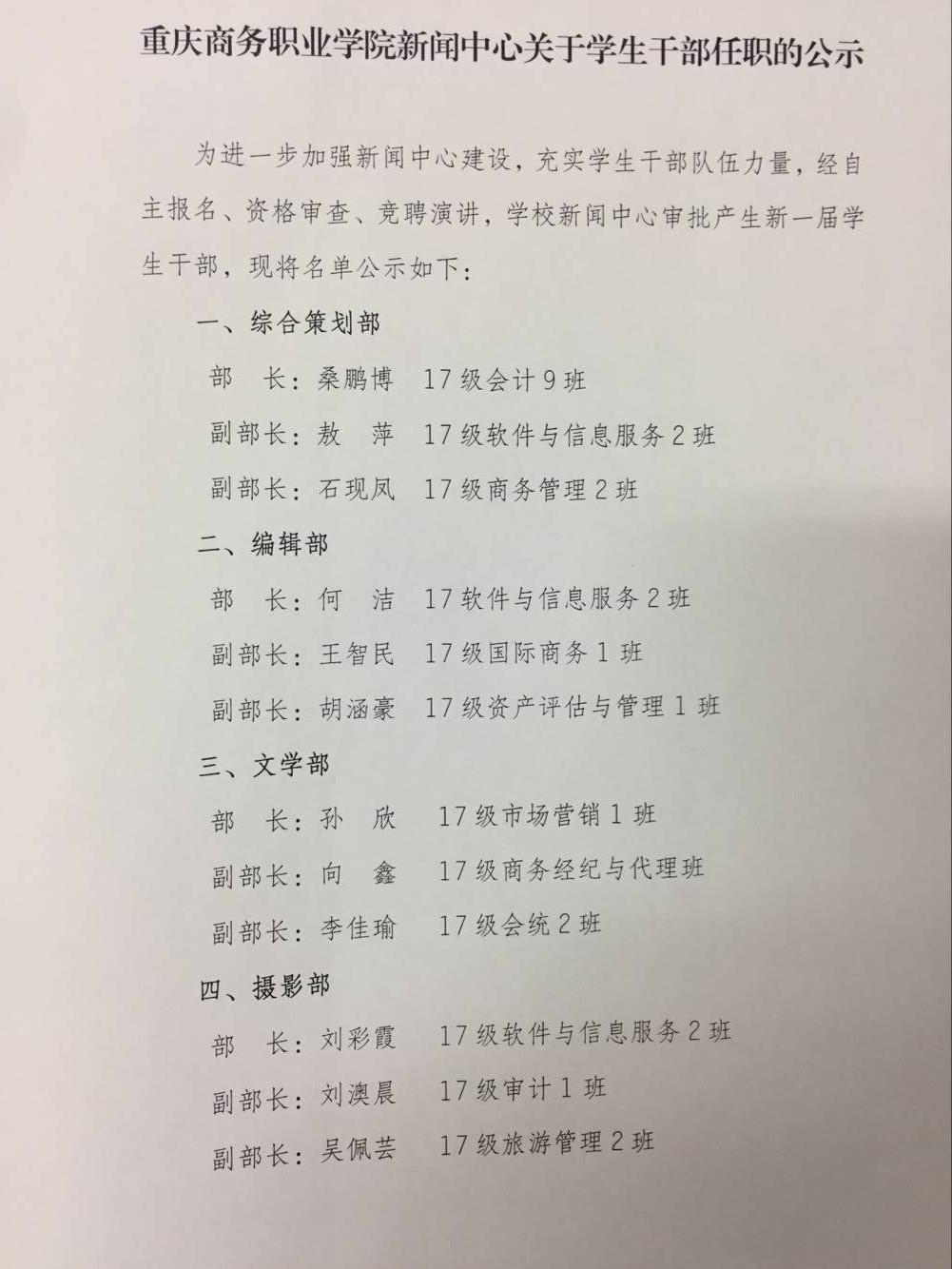 新闻中心关于学生干部任职的公示