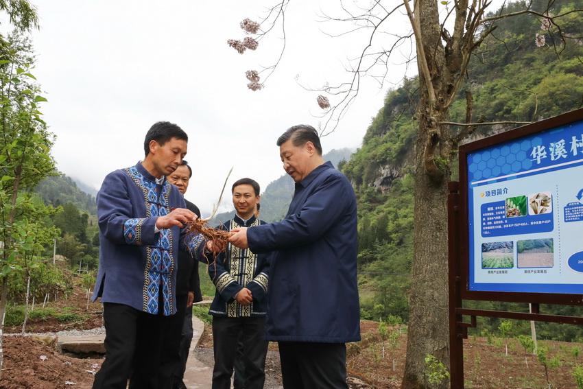 4月15日至17日,中共中央总书记、国家主席、中央军委主席习近平在重庆考察,并主持召开解决“两不愁三保障”突出问题座谈会。这是4月15日下午,习近平在石柱土家族自治县中益乡华溪村了解该村通过种植中药材黄精等特色经济作物带动村民脱贫的情况。新华社记者 鞠鹏 摄