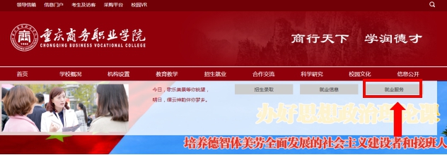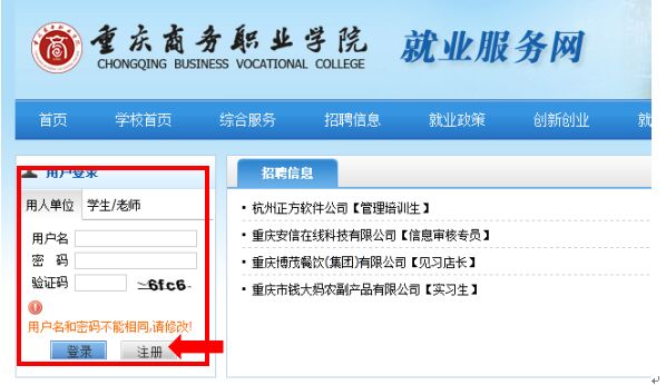 1.点击:http://zsjy.cqswxy.cn:8082/default.html 进入重庆商务职业学院就业服务网,或百度搜索“重庆商务职业学院”进入官网—点击标题栏“招生就业”—点击“就业服务网”—在就业服务网的左上角注册帐号。