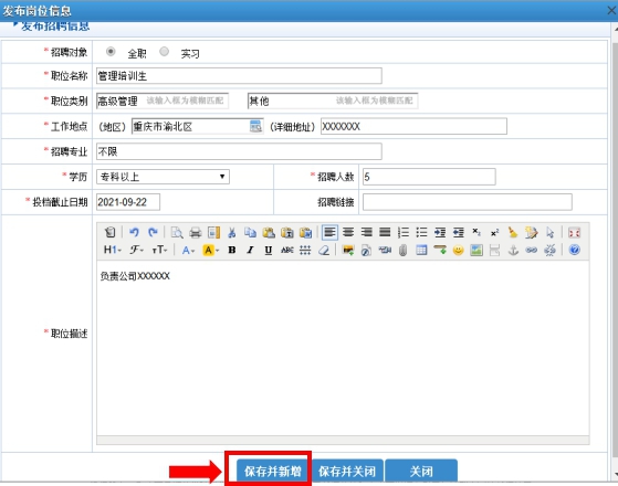 4.填写岗位信息,点击“保存并新增”