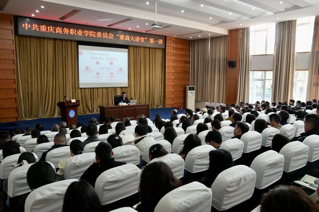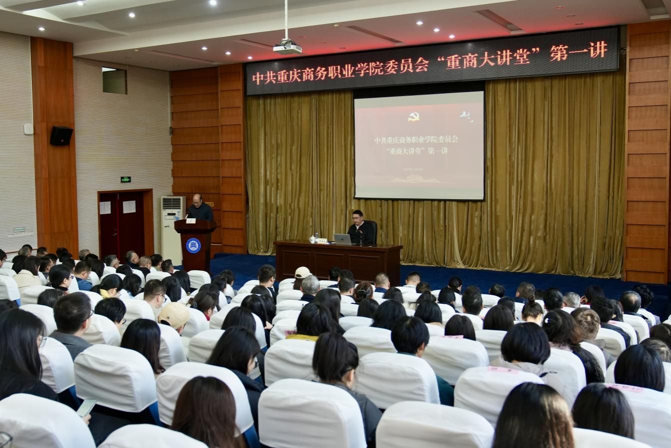 陈忠飞在主持讲座时指出,举办“重商大讲堂”,是学校深入贯彻落实党的二十大和二十届三中全会、全国全市教育大会精神的实际行动,是深学笃用习近平总书记关于教育的重要论述和视察重庆重要讲话重要指示精神、服务全市经济社会发展的具体举措,是推进学校治理体系和治理能力现代化,推动学校高质量发展的迫切需要。他强调,举办“重商大讲堂”就是要让广大师生了解国际国内形势、触碰前沿科学技术,熟悉行业最新发展动态,开拓视野、提升格局,跳出自己的“一亩三分地”,站在助力实现中华民族伟大复兴的高度,站在为“一带一路”、成渝地区双城经济圈、内陆开放高地、国际消费中心城市、西部陆海新通道建设等提供技术技能人才支撑的高度,站在“为谁培养人,培养什么人,怎样培养人”的高度,站在创建“新双高”、建设本科层次商务类职业技术大学的高度,看学校、看工作、看自己,紧跟时代步伐,不断提升自我,为学校不断提升办学治校和育人水平贡献力量。
